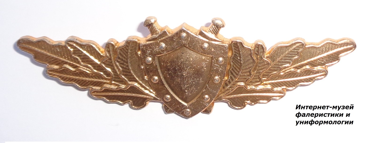 Представляет собой знак в виде изображения золотистого треугольного, вытянутого книзу щита, наложенного на перекрестье из двух мечей, поставленных остриями вниз в обрамлении золотых дубовых листьев.