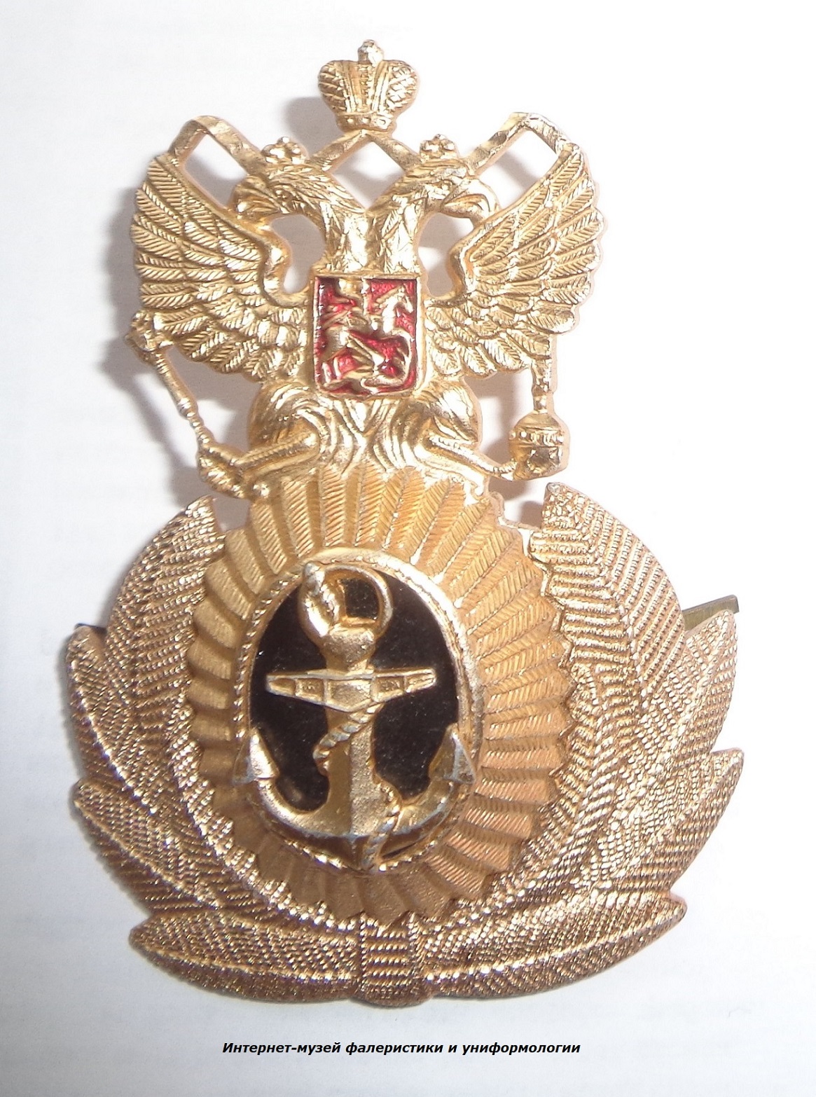 Представляет собой эллипс, покрытый черной эмалью, с боковой поверхностью из 32 двухгранных лучей с рифлёными гранями. Внутри эллипса расположен якорь золотистого цвета. Эмблема в виде венка из лавровых листьев, перевязанных внизу лентой. В верхней части кокарды расположен Государственный герб Российской Федерации.