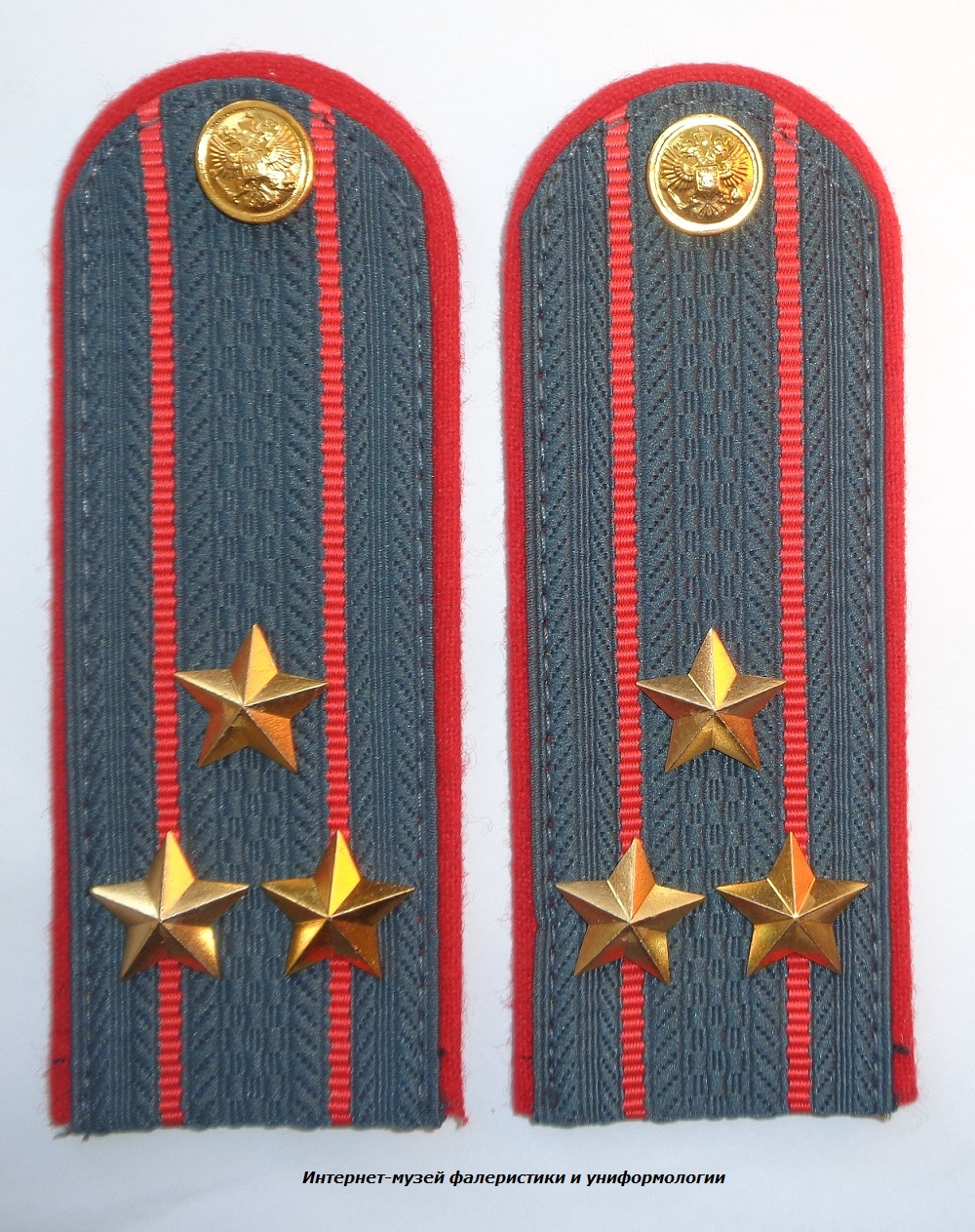 Погоны прямоугольные с закругленными верхними краями и пуговицами в верхней части, полями из галуна специального переплетения темно-серого цвета, просветами и кантами красного цвета.