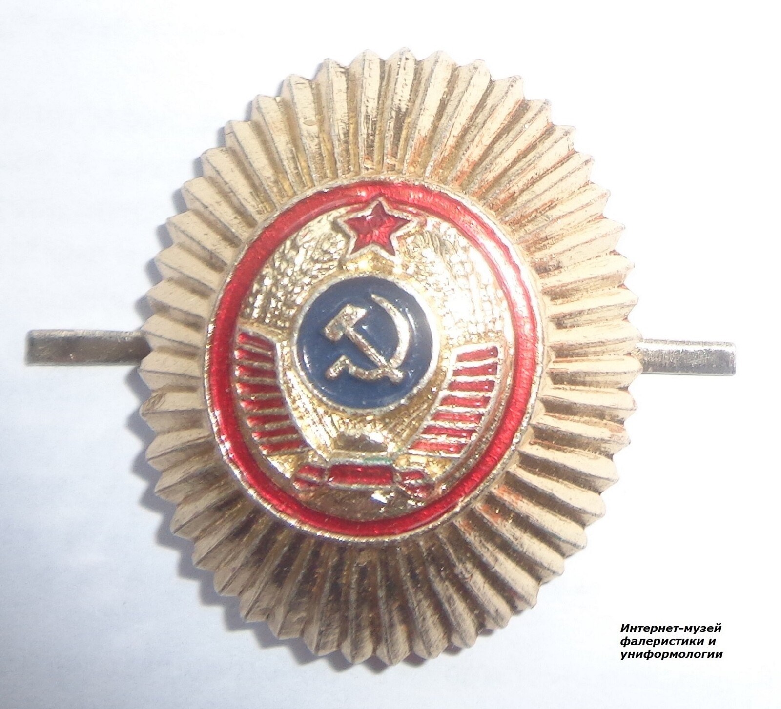 Новинка музея - повседневная кокарда комиссаров милиции, начальствующего и рядового состава милиции образца 1965 года. Кокарда цельноштампованная в виде выпуклой овальной розетки золотистого цвета, в центре которой расположен герб СССР, лента и звезда герба выложены красной эмалью. Герб СССР обрамлен ободком, выложенным красной эмалью. От ободка до краев кокарда имеет гофрированную полированную поверхность. | |
