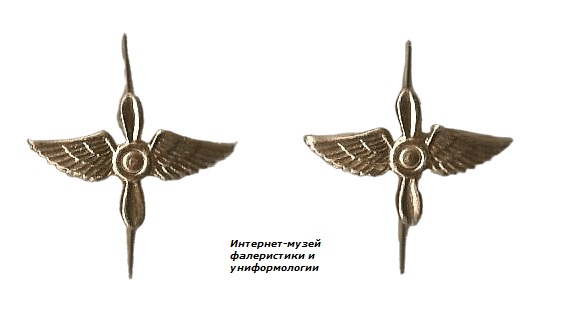 Петличные знаки различия Военно-Воздушных Сил РФ образца 2004 года для парадной и повседневной формы одежды. Представляют собой знаки в виде пропеллера с парящими крыльями.