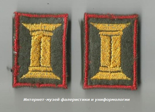 Представляют собой тканевые нашивки в форме прямоугольников защитного цвета с кантами красного цвета. В центре расположены вертикальные прямоугольники с выступающими верхним и нижним основаниями, вышитые нитями золотистого цвета.