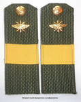 Погоны прямоугольные с трапециевидными верхними краями и пуговицами в верхней части, полями из галуна специального переплетения защитного цвета и просветами голубого цвета.