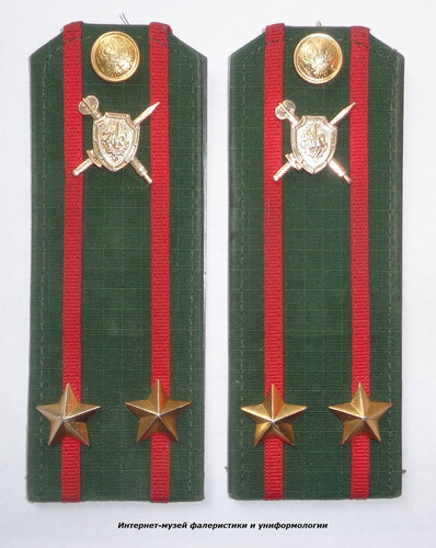 Погоны прямоугольные с трапециевидными верхними краями и пуговицами в верхней части, полями защитного цвета и просветами красного цвета.