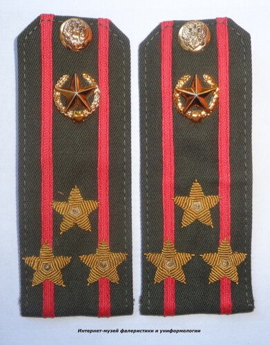 Погоны прямоугольные с трапециевидными верхними краями и пуговицами в верхней части, полями из ткани защитного цвета и просветами красного цвета. Звезды на погонах вышиты металлизированной нитью, эмблемы и пуговицы пластиковые.