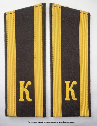 Погоны прямоугольные со скошенными верхними краями, полями из сукна черного цвета, продольными полосами золотистого цвета и буквами "К" золотистого цвета, выполненными из ПВХ-пленки.
