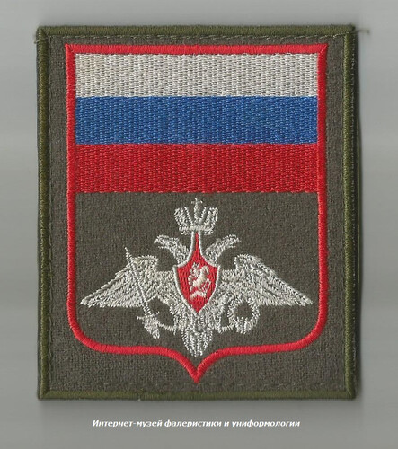 Нарукавный знак для повседневной (вариант № 2) военной формы одежды военнослужащих Министерства обороны Российской Федерации образца 2015 года. Представляет собой тканевую прямоугольную нашивку защитного цвета с расположенным на ней четырехугольным щитом с закругленными нижними углами, заостренным в оконечности, с кантом красного цвета. В верхней части нарукавного знака — изображение Государственного флага Российской Федерации (отношение ширины к длине 2:3); в нижней части нарукавного знака — изображение эмблемы Министерства обороны Российской Федерации (изображение серебристого двуглавого орла с распростертыми крыльями, держащего в правой лапе меч, а в левой - лавровый венок. На груди орла расположен щит, увенчанный короной. На щите на красном поле - всадник, поражающий копьем дракона).