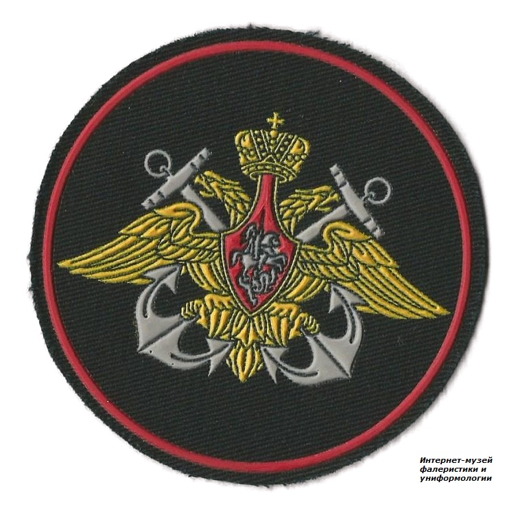 Представляет собой тканевую нашивку в форме круга черного цвета с кантом красного цвета. В центре знака - изображение эмблемы Военно-Морского Флота - золотого двуглавого орла с распростертыми крыльями, держащего в лапах два скрещенных за его спиной серебряных адмиралтейских якоря; на груди орла - красный, треугольный, вытянутый книзу щит со штоком, восходящим к короне; в поле щита - всадник, поражающий копьем дракона.