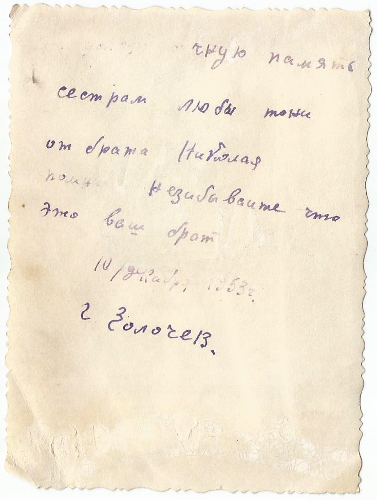 На обороте фотографии имеется подпись: «[На веч]ную память сестрам Любы Тони от брата Николая помни[те] незабывайте что это ваш брат 10 декабря 1953 г. г. Золочев». Фото из коллекции автора. | |