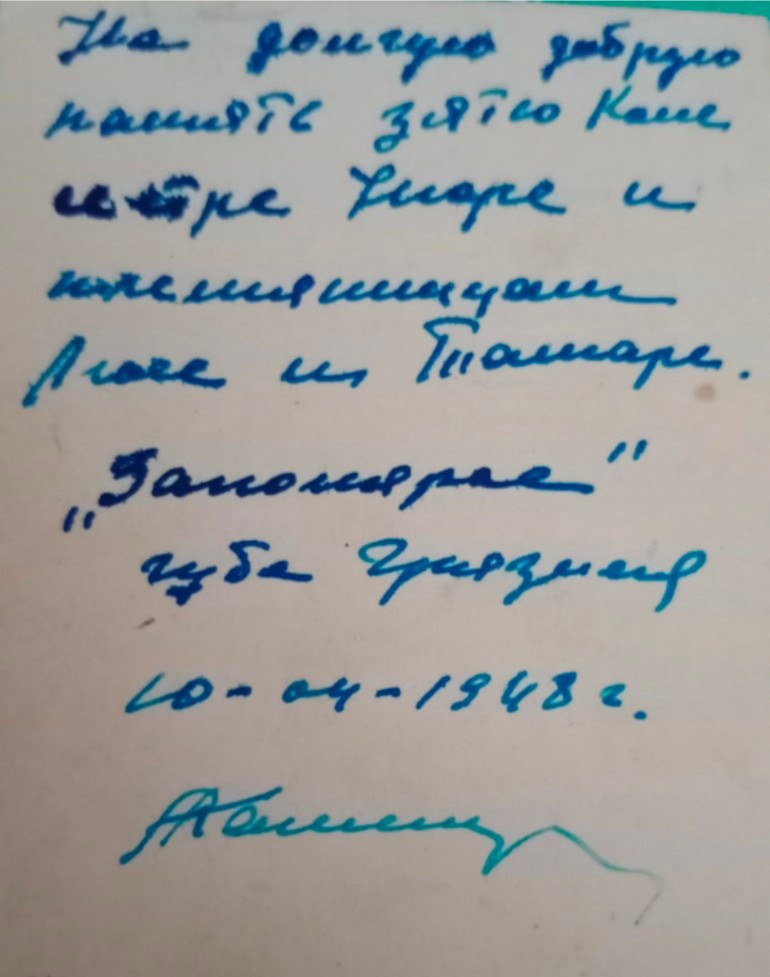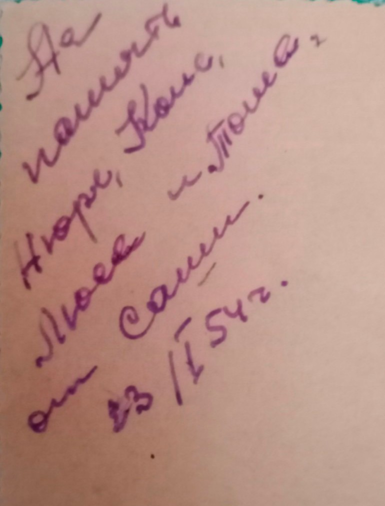 На обороте фотокарточки написано: «На память Нюре, Коле, Люсе и Томе от Саши. 23/I 54 г.».