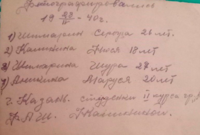 На обороте рассказано обо всех участниках встречи: «Фотографировались 19 28/IV – 40 г. 1) Шимарин Сережа 26 лет 2) Калинина Нюся 18 лет 3) Шимарина Шура 27 лет 4) Аникина Маруся 20 лет г. Казань студентки II курса гр. ФАШ Калининой».