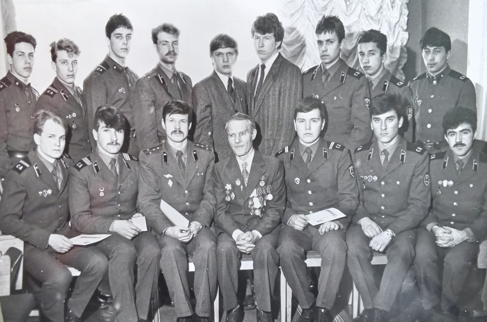 На следующей фотографии военнослужащие радиотехнических войск запечатлены во время встречи с ветераном Великой Отечественной войны – кавалером орденов Отечественной войны и «Знак почёта». На этом снимке военнослужащих срочной службы можно увидеть в парадно-выходной форме одежды, аналогичной той, что показана на предыдущем фото. Два ефрейтора и один рядовой, стоящие во втором ряду, одеты в повседневную форму одежды образца 1969 года с погонами образца 1973 года. Капитан, сидящий рядом с ветераном, заснят в повседневной форме одежды образца 1969 года. Стоящий за ним лейтенант одет в повседневную форму одежды для строя. Такой вариант униформы использовался с сапогами вместо ботинок и снаряжением (при необходимости - с полевой сумкой).