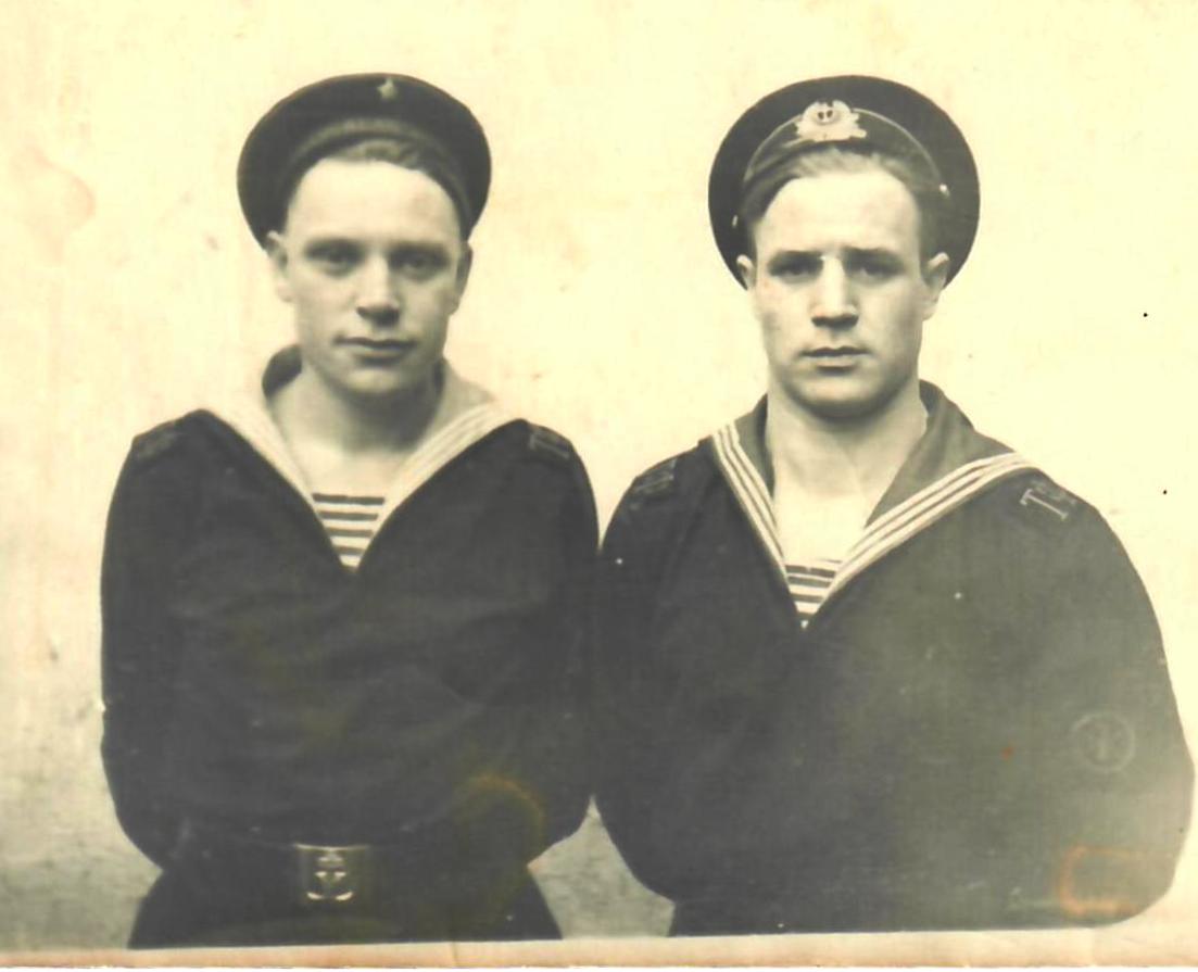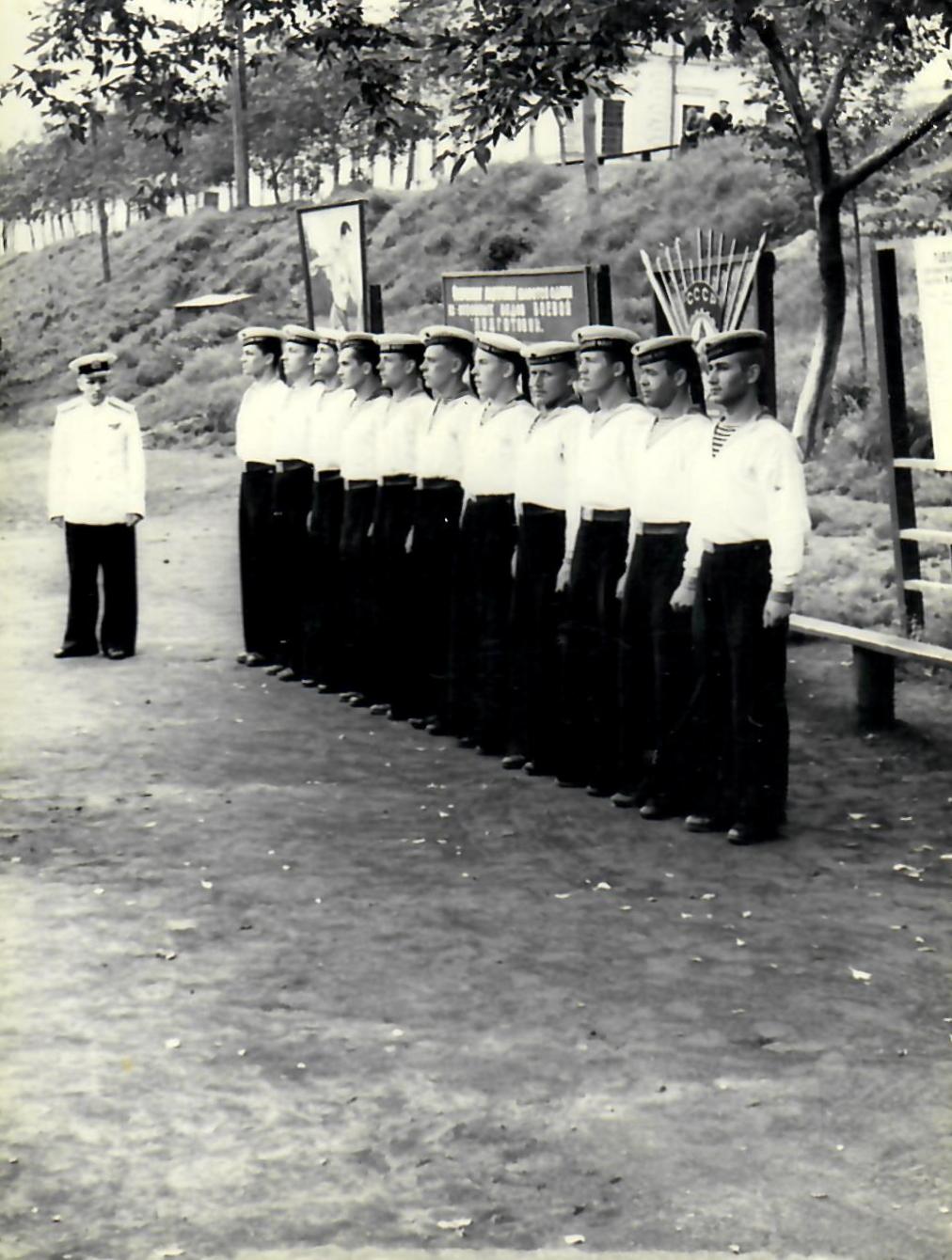 На первой фотографии он запечатлён в форме одежды № 3. На погончиках отчетливо видна шифровка «ТФ», нанесенная по трафарету. Звезда на бескозырке изготовлена из латуни. Фотокарточка имеет подпись в правом нижнем углу: «Привет из Владивостока 1955 г».