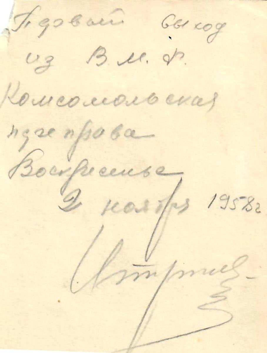 На обороте фотографии имеется подпись: «Первый выход из В. М. Ф. Комсомольская переправа воскресенье 2 ноября 1958 г.».