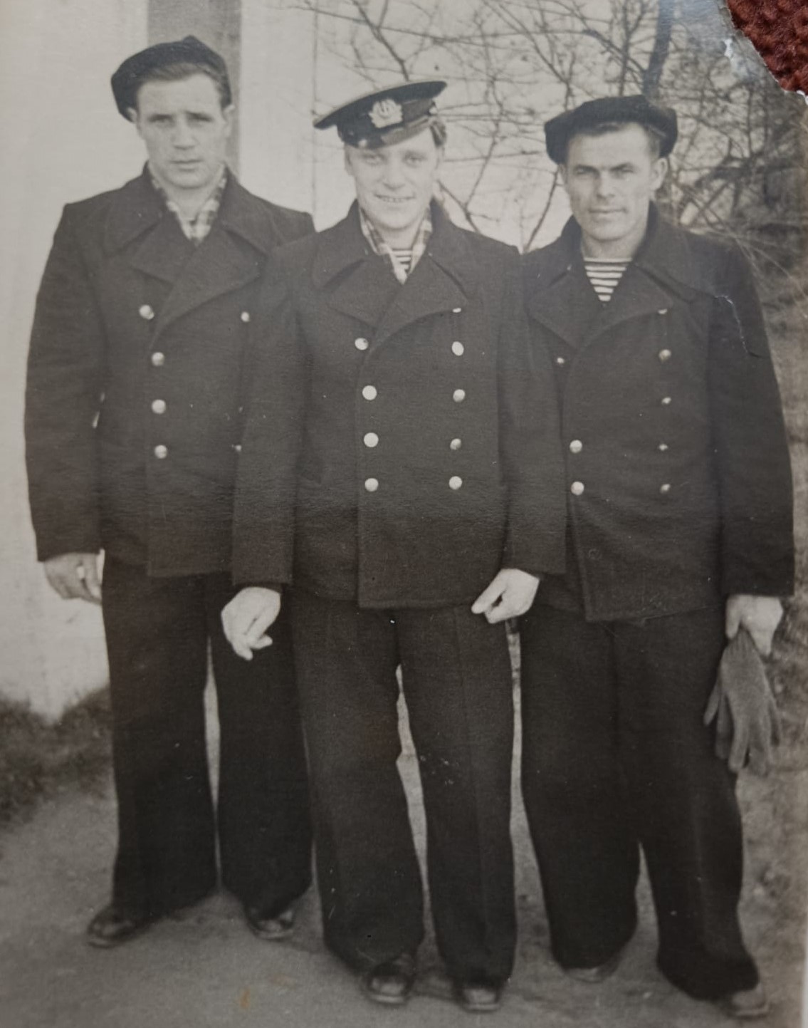 На последней фотокарточке товарищи засняты, вероятно, уже после службы на флоте. Об этом говорит отсутствие погон на бушлатах и наличие в кадре гражданских головных уборов и шарфов. | |