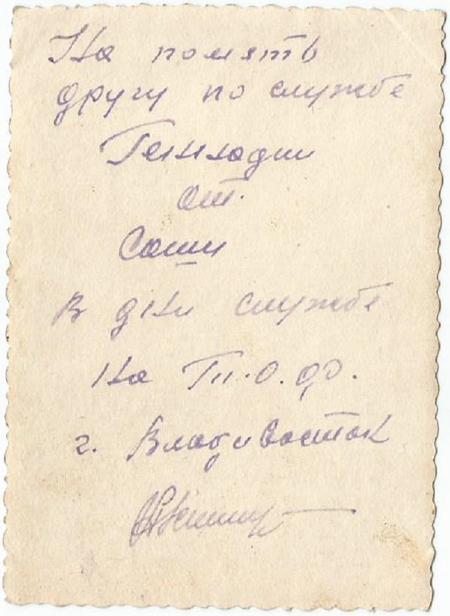 На оборотной стороне снимка имеется подпись: «На память другу по службе Геннадию от Саши в дни службы на Т. О. Ф. [Тихоокеанском флоте] г. Владивосток». Фото из коллекции автора. | |